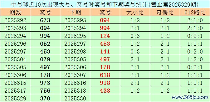 中号球:上期奖号为7,开出大号、奇号,该位前10次开出大号、奇号的表象时其奖号分裂为:673、094、994、052、453、079、497、178、973、756,其中中号球012路比为3:4:3。