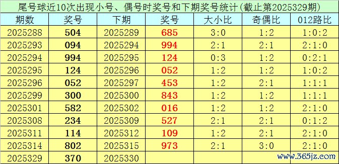 在尾号球前10次开出小 号、偶号类型之后,其下期分裂开出奖号:685、994、124、052、453、843、016、527、109、973,其中号码大小比为4:6,012路比为5:3:2,奇偶比为6:4。