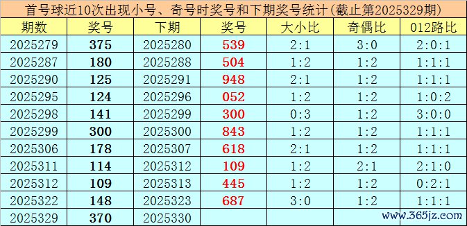 在首号球前10次开出小 号、奇号类型之后,其下期分裂开出奖号:539、504、948、052、300、843、618、109、445、687,其中号码奇偶比为5:5,大小比为6:4,012路比为5:2:3。